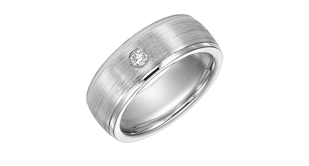 If low-maintenance is your game, palladium men's wedding bands are especially tarnish-resistant, offering the wearer all of the glitz of platinum and white gold at a fraction of the cost (and the heft). ArtCarved offers this dynamic take on the concept, beating the metal to a fascinatingly vintage-inspired textured surface.