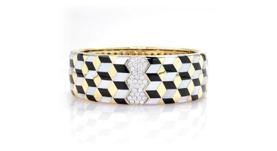 Classic statement pieces, thick bangle bracelets are versatile enough for any season, and this dynamic yellow gold, diamond, onyx, and mother of pearl bangle bracelet is a prime example. These bangles boast a spirited elegance that can elevate any outfit, whether they're sliding effortlessly over a chic sweater's sleeve or embellishing a bare wrist on sunnier days. Their design allows for seamless stacking with other bracelets, creating a layered look, or they can stand alone as a singular statement of sophistication. The interplay of diamonds, onyx, and mother of pearl in this particular piece adds a special touch, making it a must-have accessory for those who appreciate both style and versatility in their jewelry.